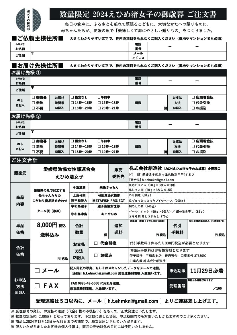 「えひめの海、人、魚を元気にしたい」「活動の輪を広げたい」そんな思いから、初めての試みとなる「えひめ渚女子のお歳暮」は誕生しました。県下の女性部の作る、地域食材をふんだんに活用したこだわりの商品を一つの箱に詰め合わせ、思いとともに全国に届けます。