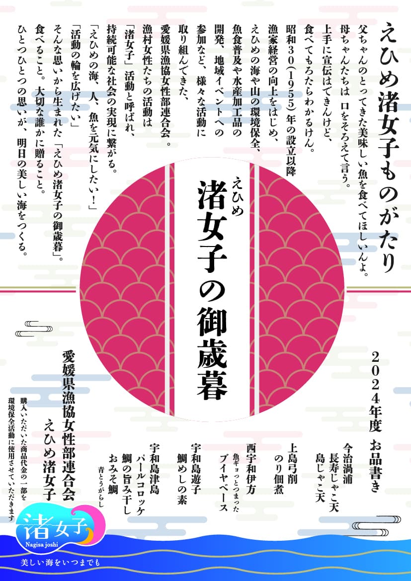 「えひめの海、人、魚を元気にしたい」「活動の輪を広げたい」そんな思いから、初めての試みとなる「えひめ渚女子のお歳暮」は誕生しました。県下の女性部の作る、地域食材をふんだんに活用したこだわりの商品を一つの箱に詰め合わせ、思いとともに全国に届けます。